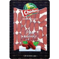 Vepřové maso (min. 85%), Vepřové sádlo, Pitná voda, Bramborový škrob, Jedlá sůl, Koření, Extrakty koření, Přírodní aroma, Stabilizátor (trifosforečnany), Antioxidant (erythorban sodný), Cukr, Barvivo (košenila), Konzervant (dusitan sodný), Obal: kolagenní střívko, Obsah tuku do: 50%