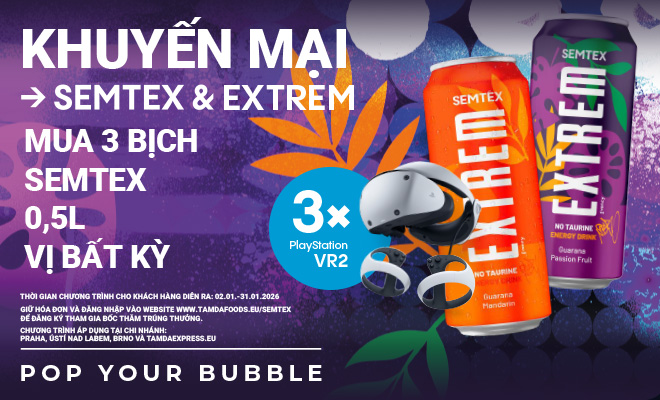Từ 02.01 đến 31.01.2026, khách hàng mua 3 bịch SEMTEX vị bất kỳ tại các chi nhánh Praha, Ústí nad Labem, Brno hoặc TamdaExpress.eu, giữ lại hóa đơn và đăng ký tham gia bốc thăm tại: