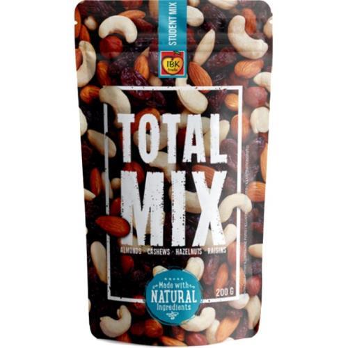 rozinky 50 % (rozinky, slunečnicový olej), mandle jádra neloupaná 15 %, mandle jádra loupaná 5 %, kešu ořechy jádra nepražená 20 %, lísková jádra 10 %.