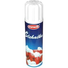 Pitná voda, ztužený rostlinný tuk z palmových jader (18%), cukr (7%), stabilizátory: E420ii, E463 a E401, MLÉČNÉ bílkoviny, emulgátory: E472e, SÓJOVÝ lecitin (E322) a E472b, jedlá sůl, aroma, barvivo: E160a, propellant: E942. Obsah tuku: 18%.