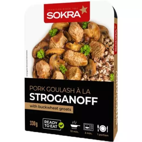 Sokra guláš vepřový a la stroganov s pohankou 330g