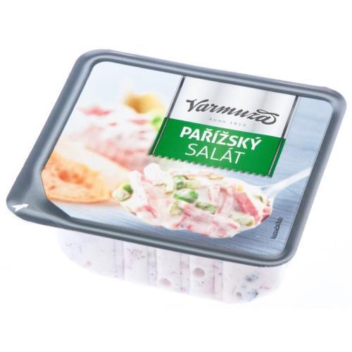 Pařížský salám [vepřové maso 70%, pitná voda, jedlá sůl s jodem (jedlá sůl, jodičnan draselný), hovězí maso, koření, česnek, stabilizátor: difosforečnany, vepřová bílkovina, konzervant: dusitan sodný, dextróza, maltodextrin, cukr, barvivo: paprikový extrakt], majonéza (řepkový olej, pitná voda, cukr, pasterovaný VAJEČNÝ ŽLOUTEK, ocet kvasný lihový, jedlá sůl, zahušťovadla: guma guar, xanthan, konzervant: benzoan sodný), sterilované okurky (okurky, ocet kvasný lihový, cukr, jedlá sůl, koření), sterilovaný hrášek (hrách, ocet kvasný lihový, cukr, jedlá sůl, aroma), marinovaná cibule (cibule, ocet kvasný lihový, jedlá sůl), HOŘČICE (pitná voda, HOŘČIČNÉ SEMENO, ocet kvasný lihový, cukr, jedlá sůl, koření), koření.